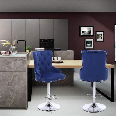 CGC Blue Brushed Velvet Chrome Studded Luxury Adjustable Bar Stool